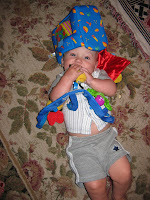 Ethan turned 8 months old on 8/24/08. He is starting to shake his butt when he is on all fours; has not grasped the concept of actually moving his hands and legs though. He would rather sprawl out flat on his stomach.